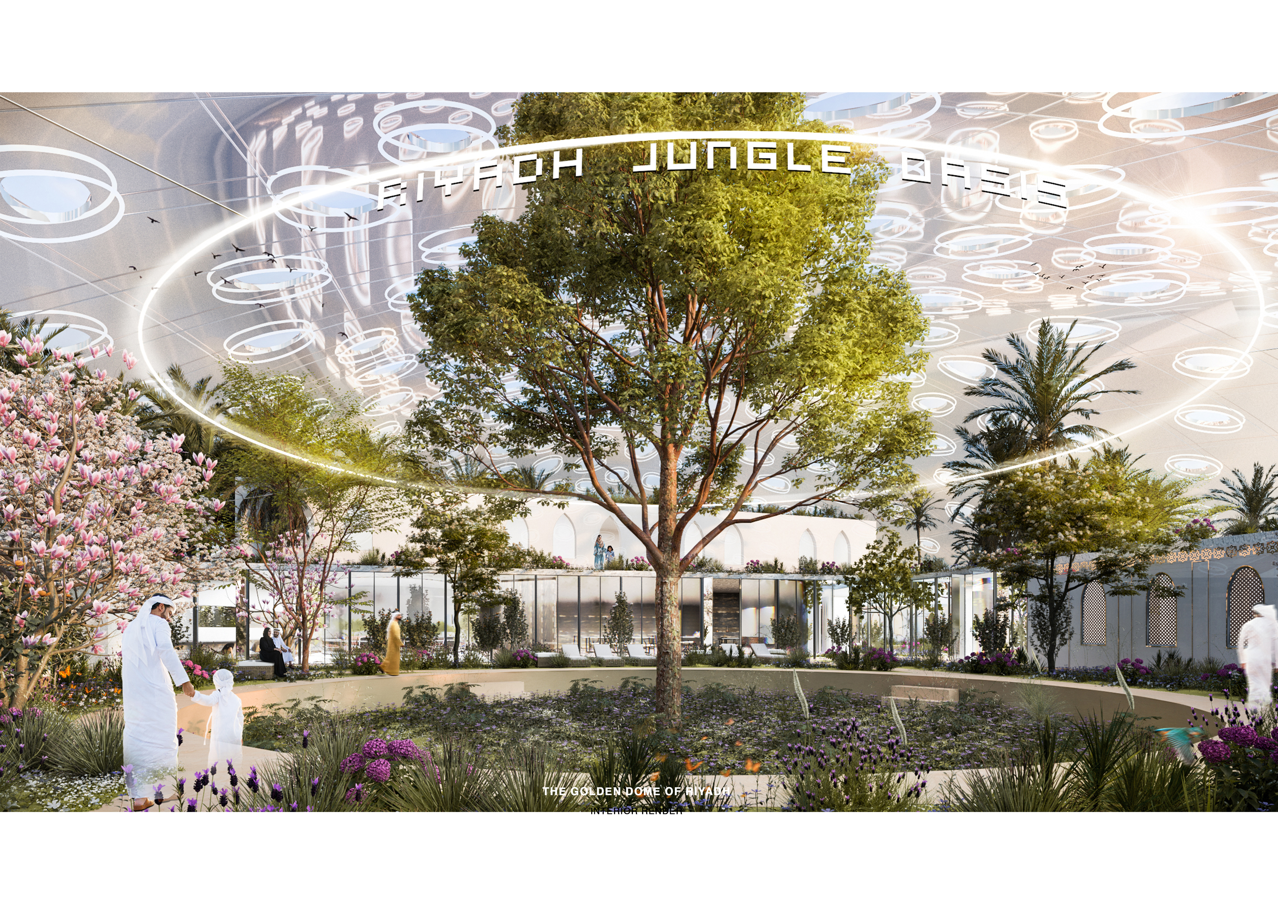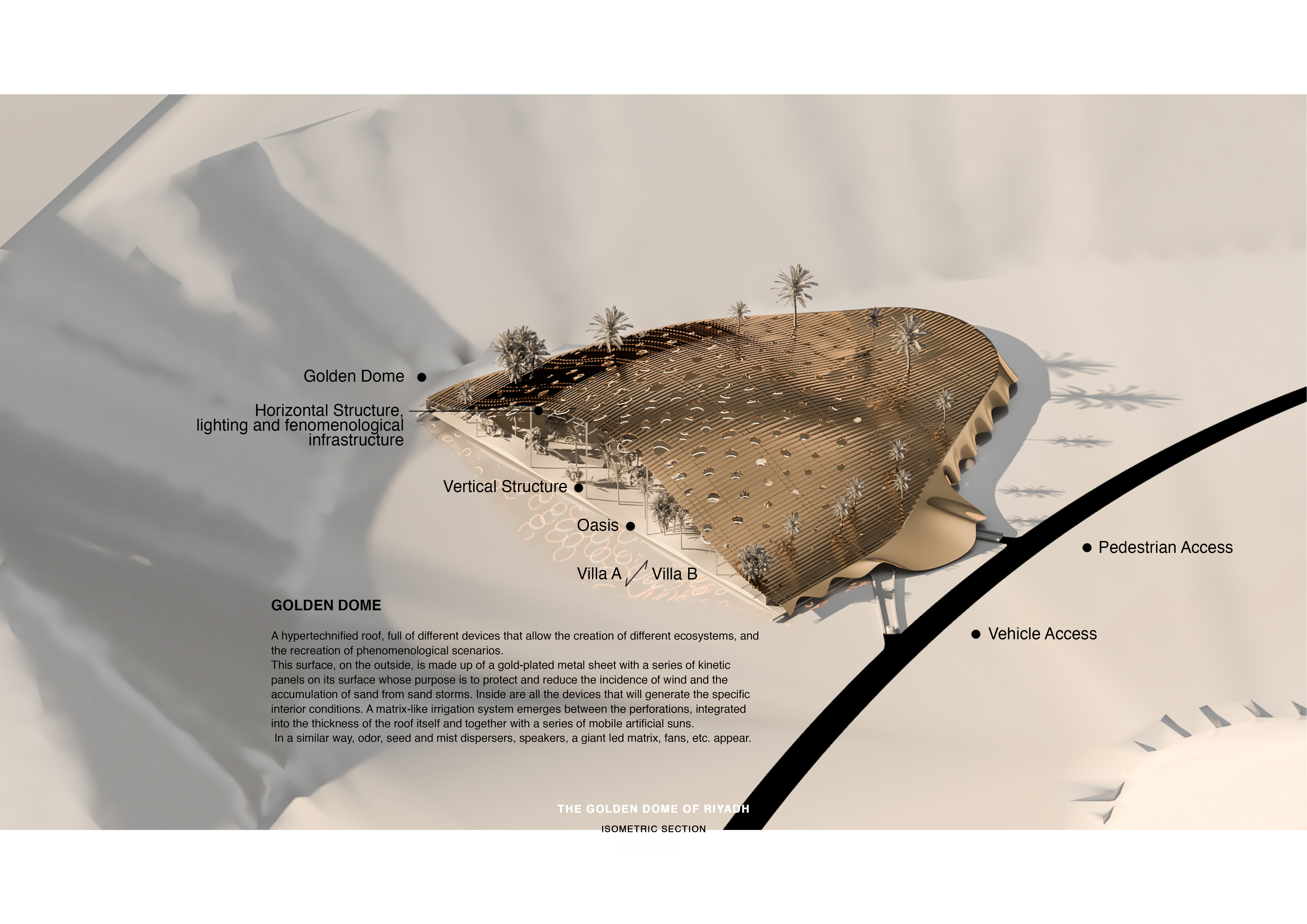 A golden dome, which houses in its interior the most exuberant oases of the Riyadh desert, inside are two luxurious villas, surrounded by abundant vegetation, ecosystems, places of rest and nature. These villas are in perfect harmony with the plant species that grow around them. Courtyards illuminated by artificial suns appear, perforations in the roof that allow light to enter and the trees to leave, large windows, floating garages, communities of animals that cohabit the space, etc. Two separate residences but that share an eventual landscape.