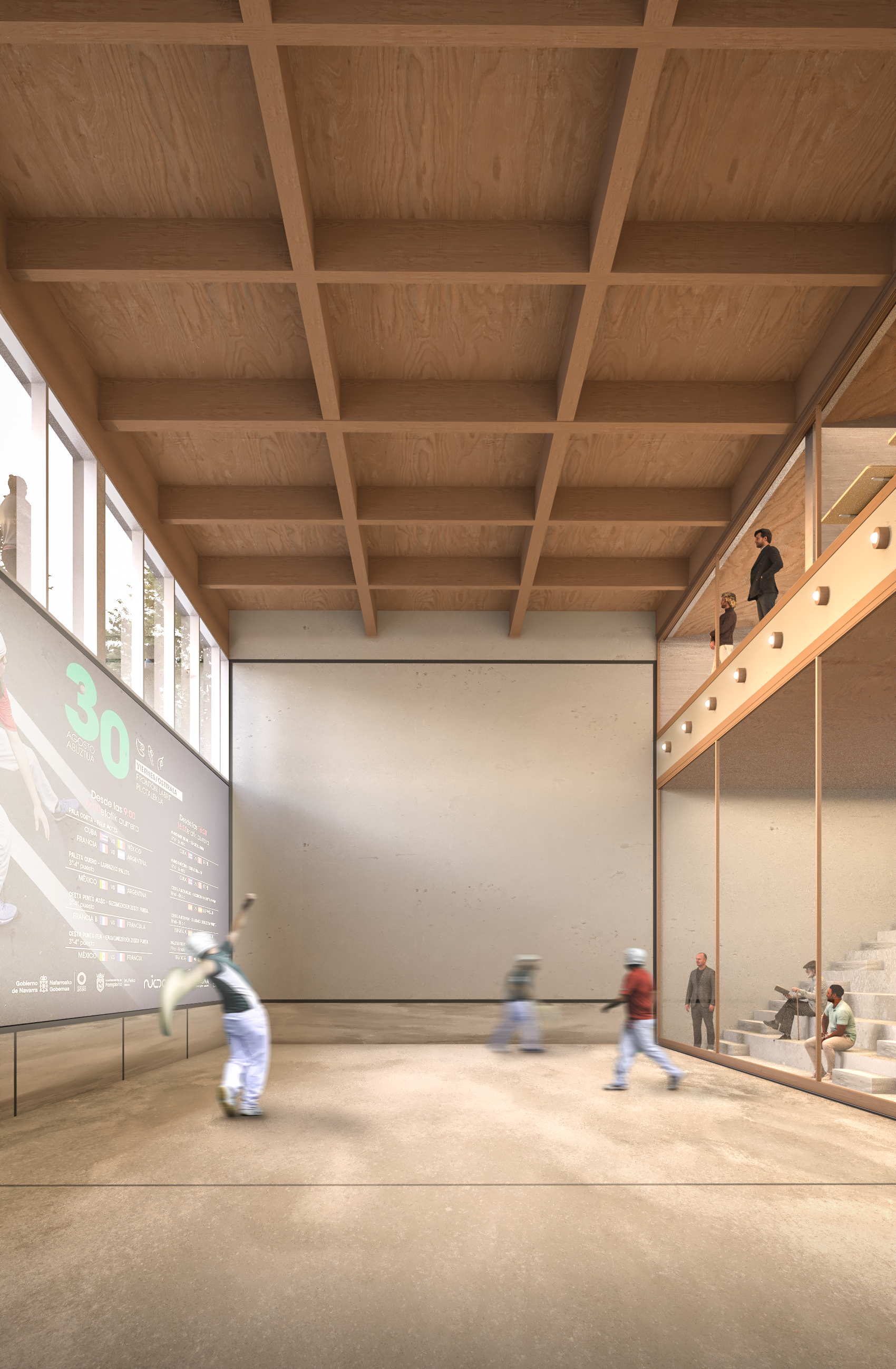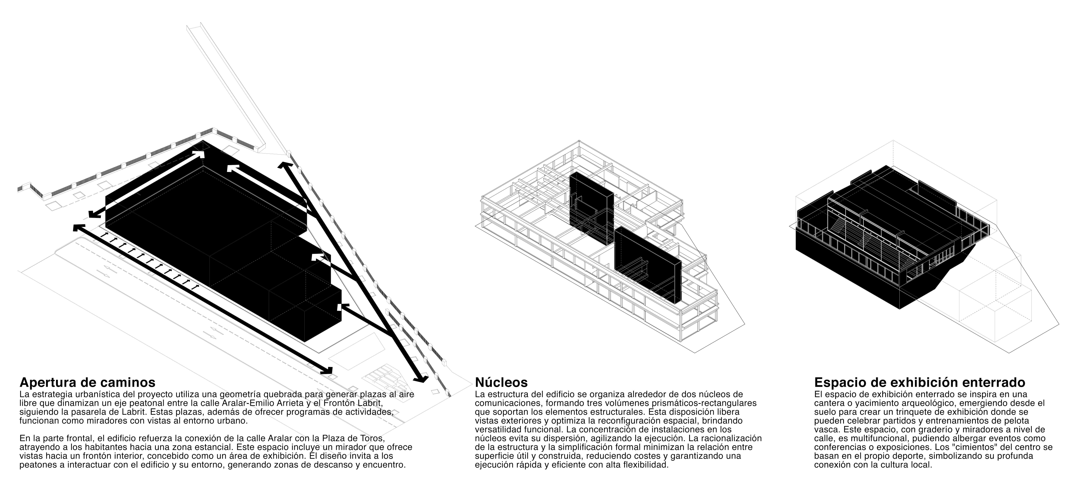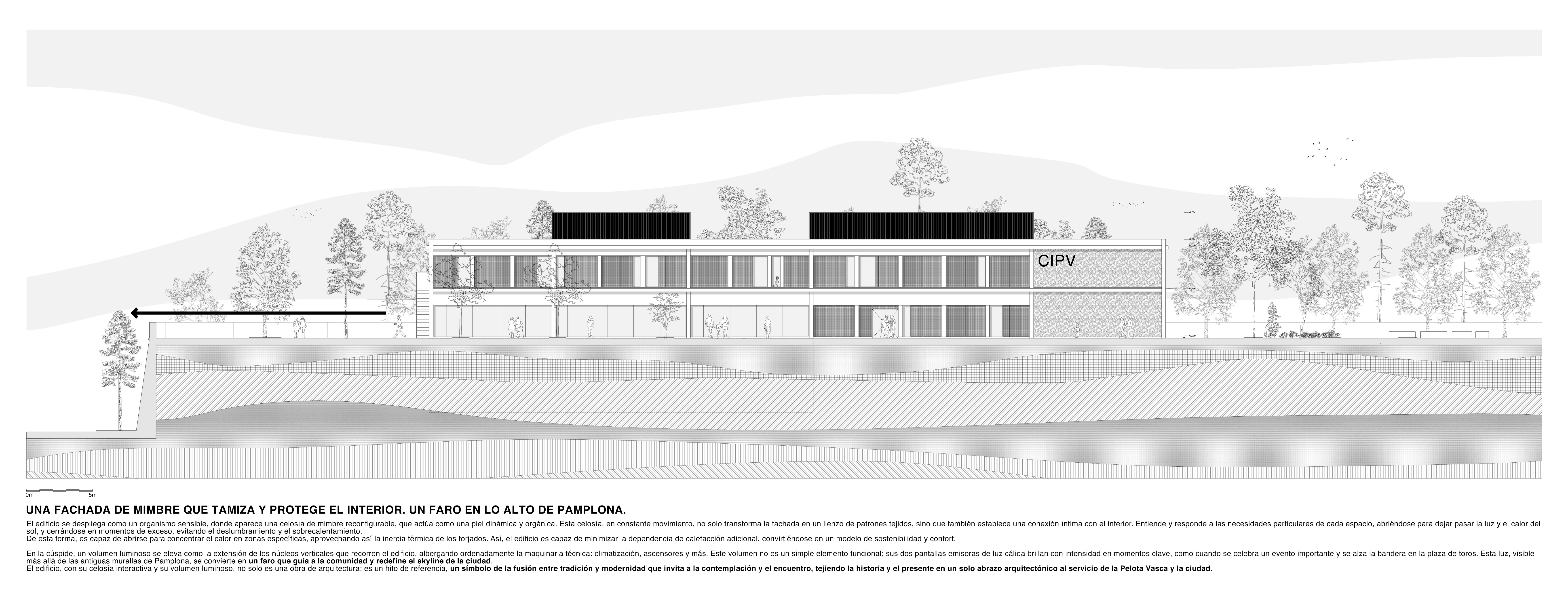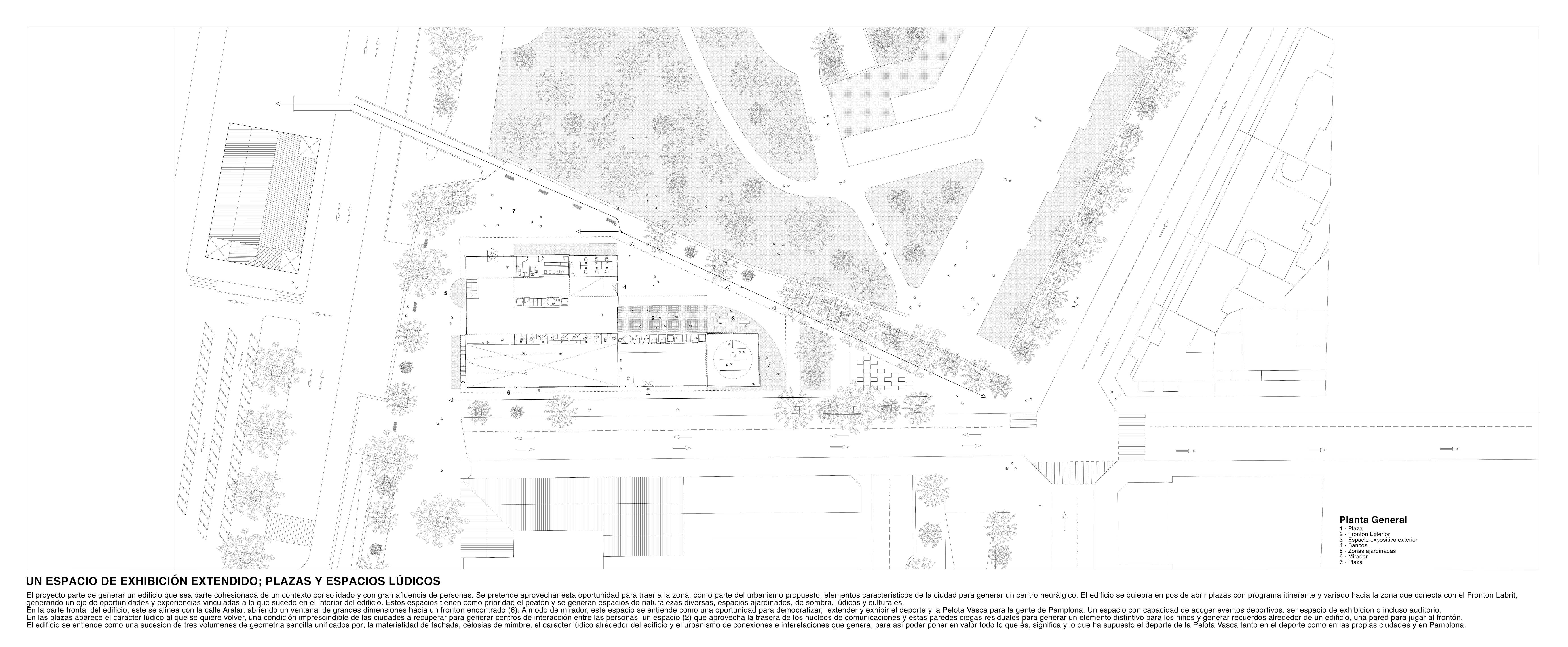 “Un frontón tras la celosía” nace con la intención de revitalizar una zona emblemática en el centro de Pamplona, otorgándole una nueva vida mediante la creación de un edificio cultural y la intervención urbanística de su entorno inmediato. En su núcleo, este proyecto plantea un diálogo entre el pasado y el presente, con la construcción de un centro de interpretación de la pelota vasca, deporte profundamente enraizado en la identidad cultural de la región, y una serie de actuaciones que buscan recuperar el carácter lúdico y social del espacio público.