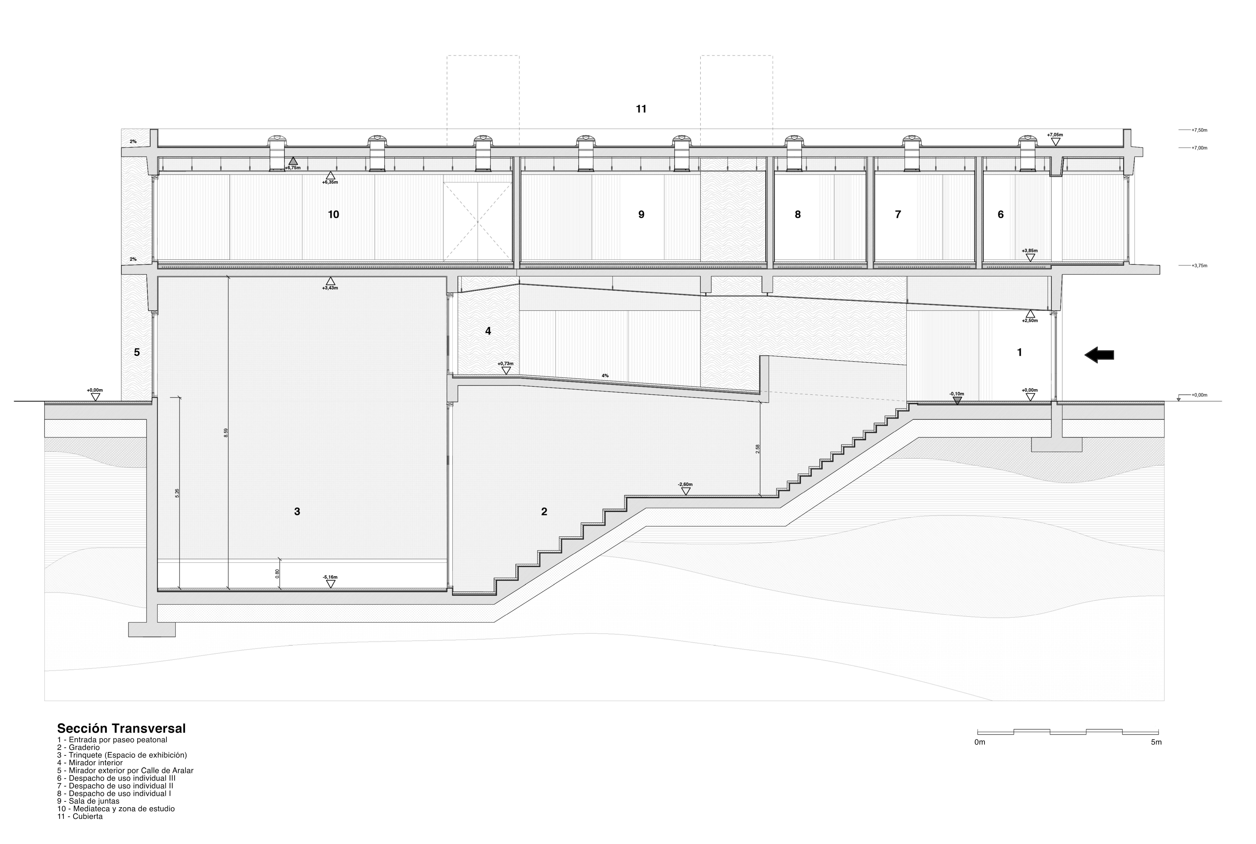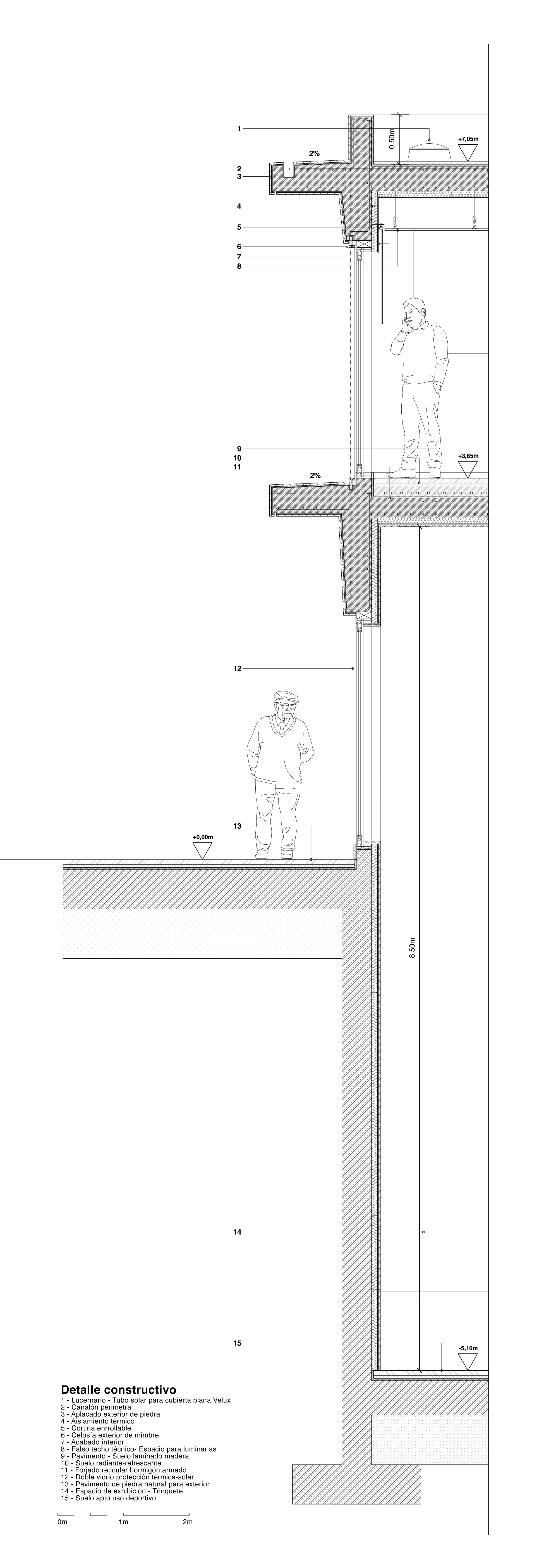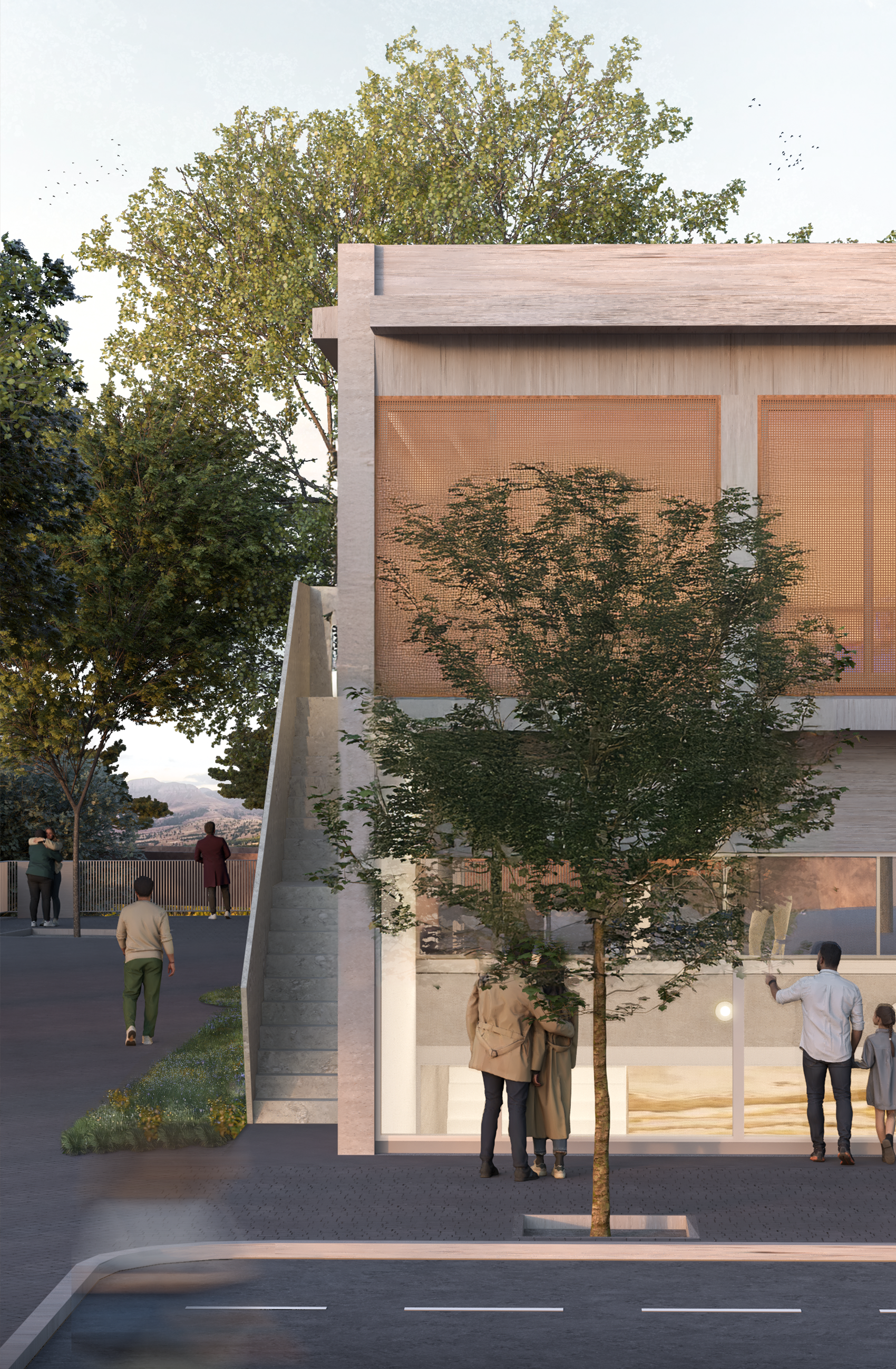 Un edificio volumétricamente sencillo que busca integrarse respetuosamente en su entorno, que utiliza materiales que resuenan en la memoria colectiva de Pamplona, como los muros de piedra que evocan las fortificaciones históricas de la ciudad y el mimbre, inspiradose en las cestas de las canastas con las que se juega a la pelota vasca. Esta materialidad no solo ancla el edificio en el contexto tangible de la ciudad, sino que lo vincula a los elementos intangibles de su patrimonio, como las tradiciones y los juegos que forman parte de la vida cotidiana de sus habitantes.
