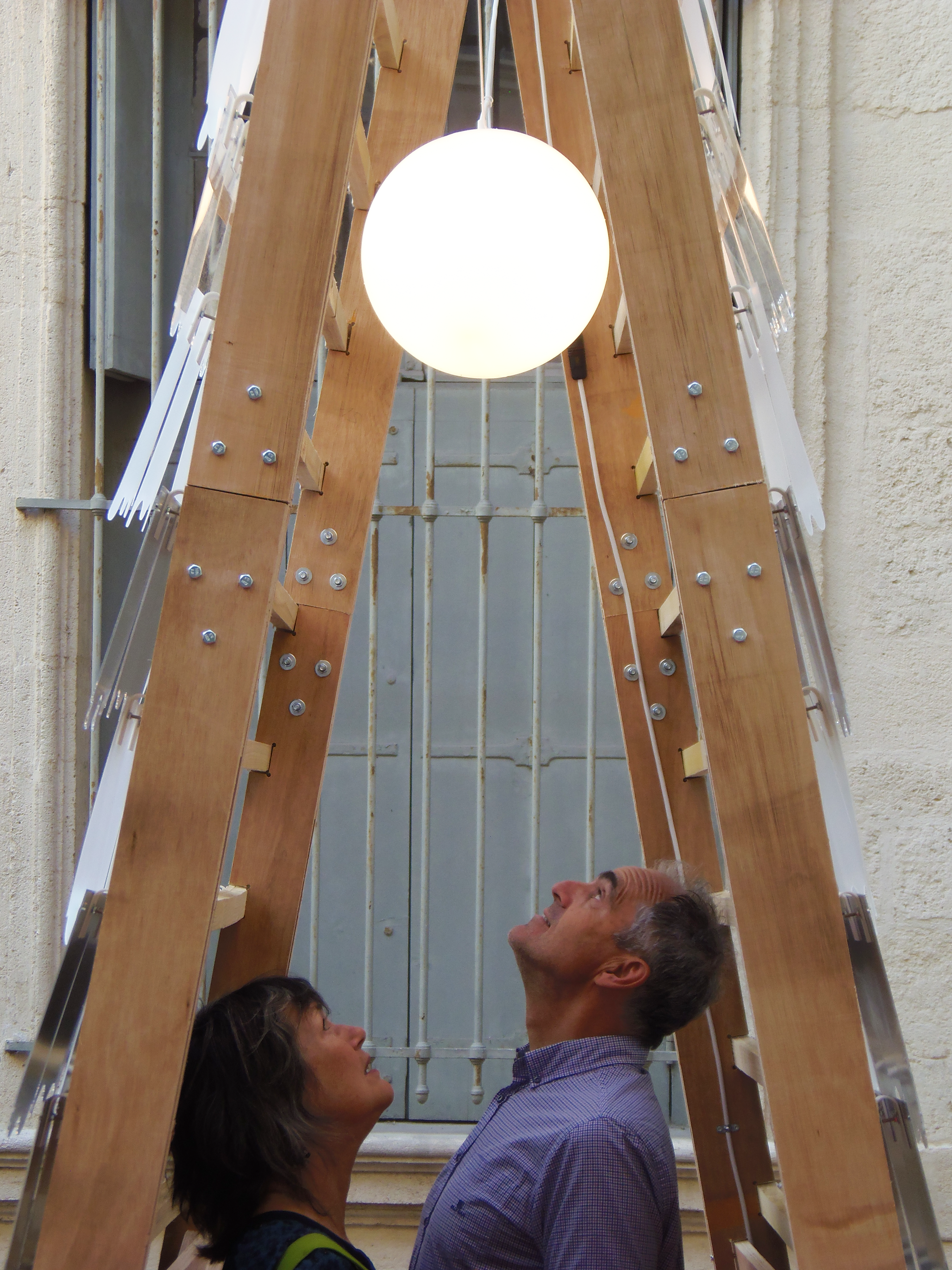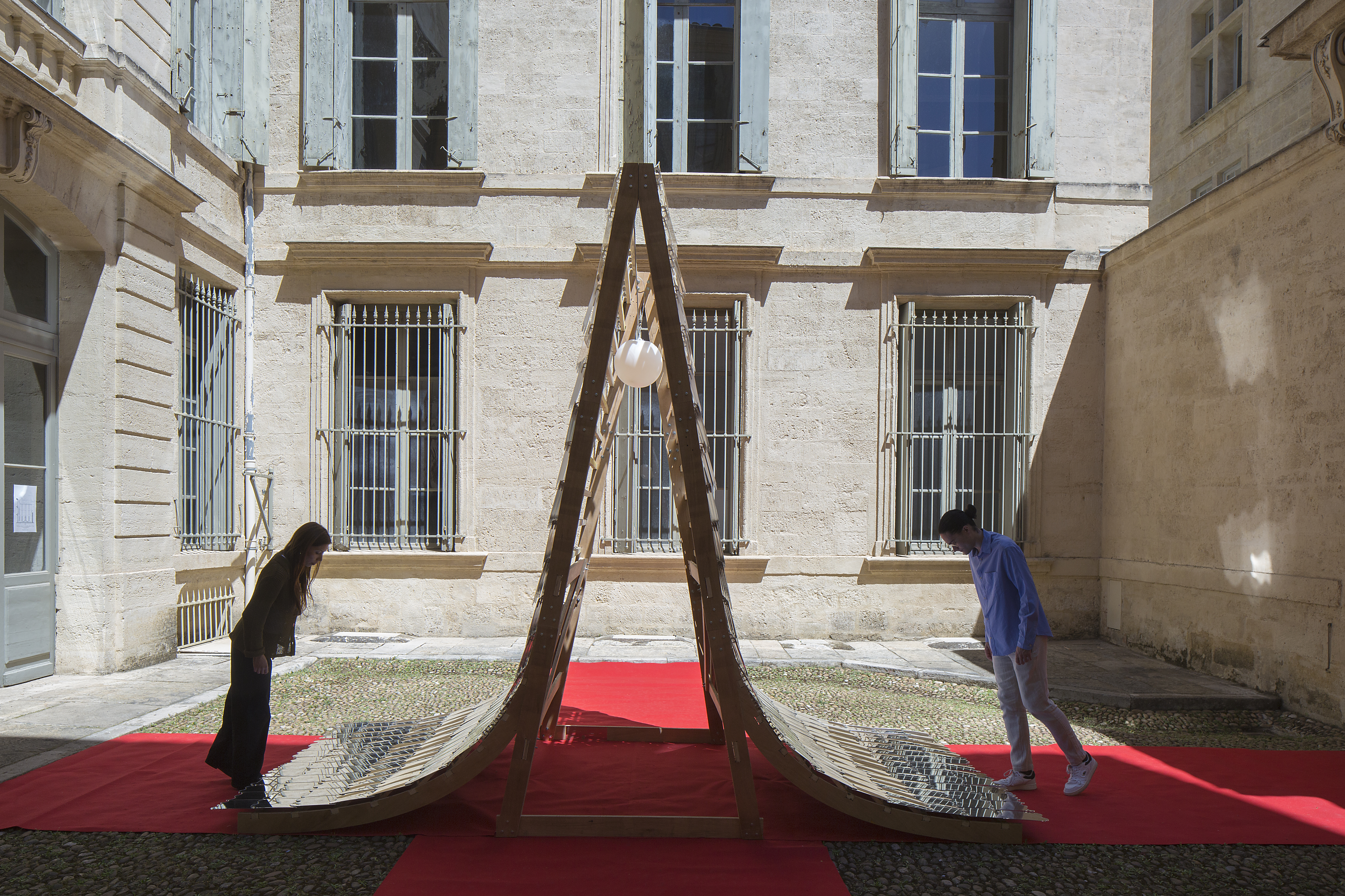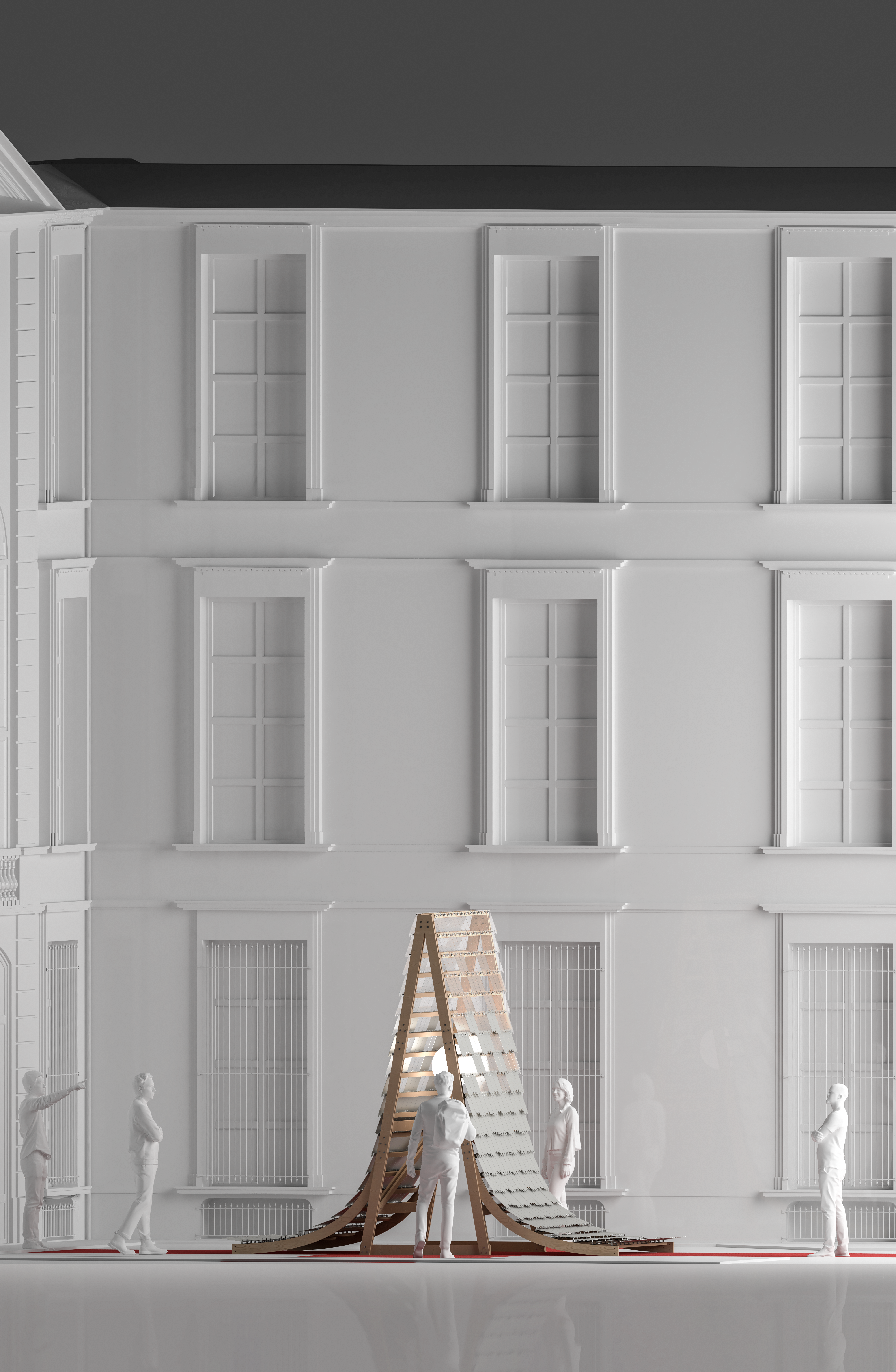 An artifact that acts as a scenographic background appears, capable of generating rhythm inside a patio. A device that transforms the courtyard into a stage where the movement of the people around it and their way of interacting with it, is the performance itself.