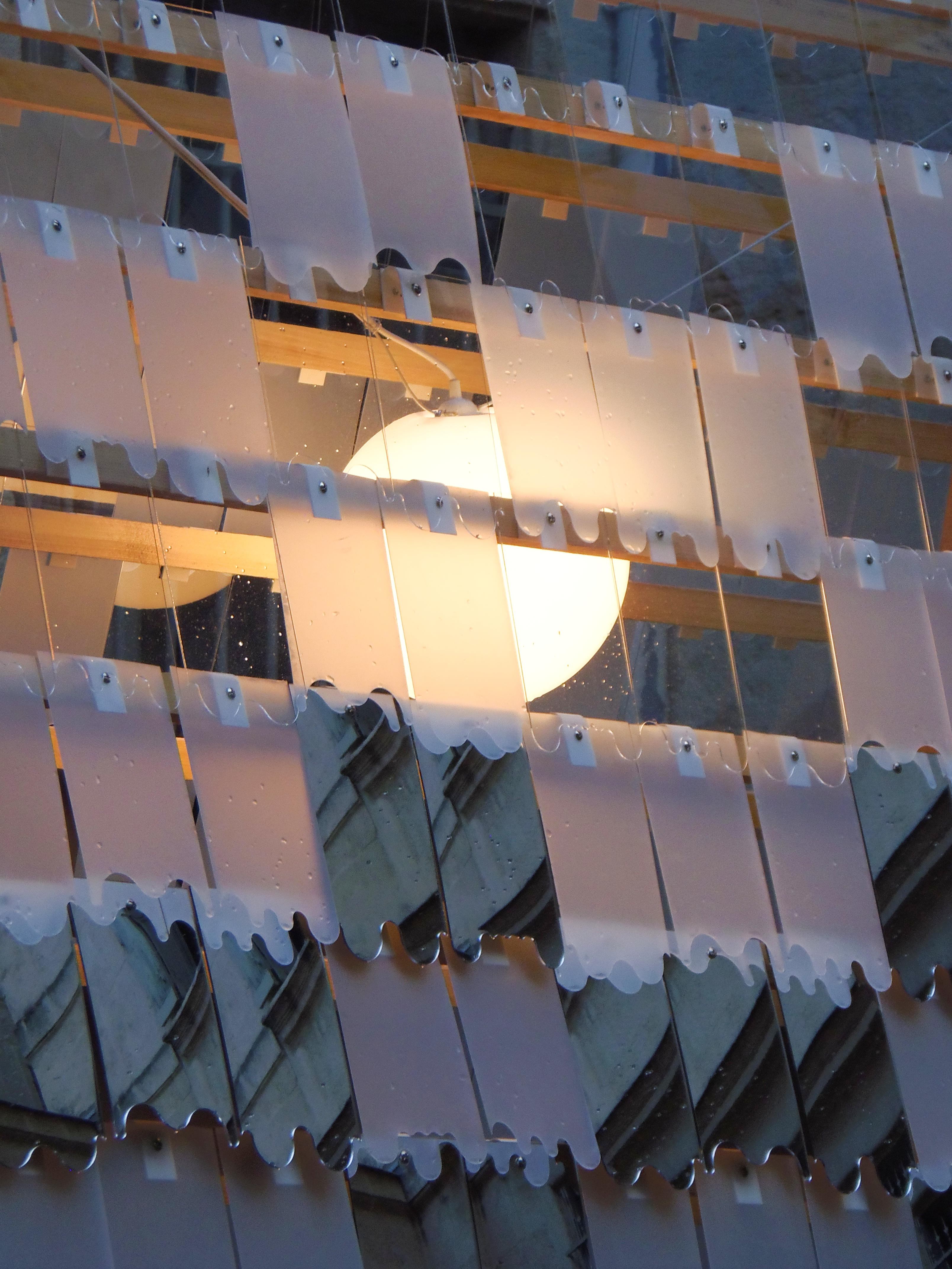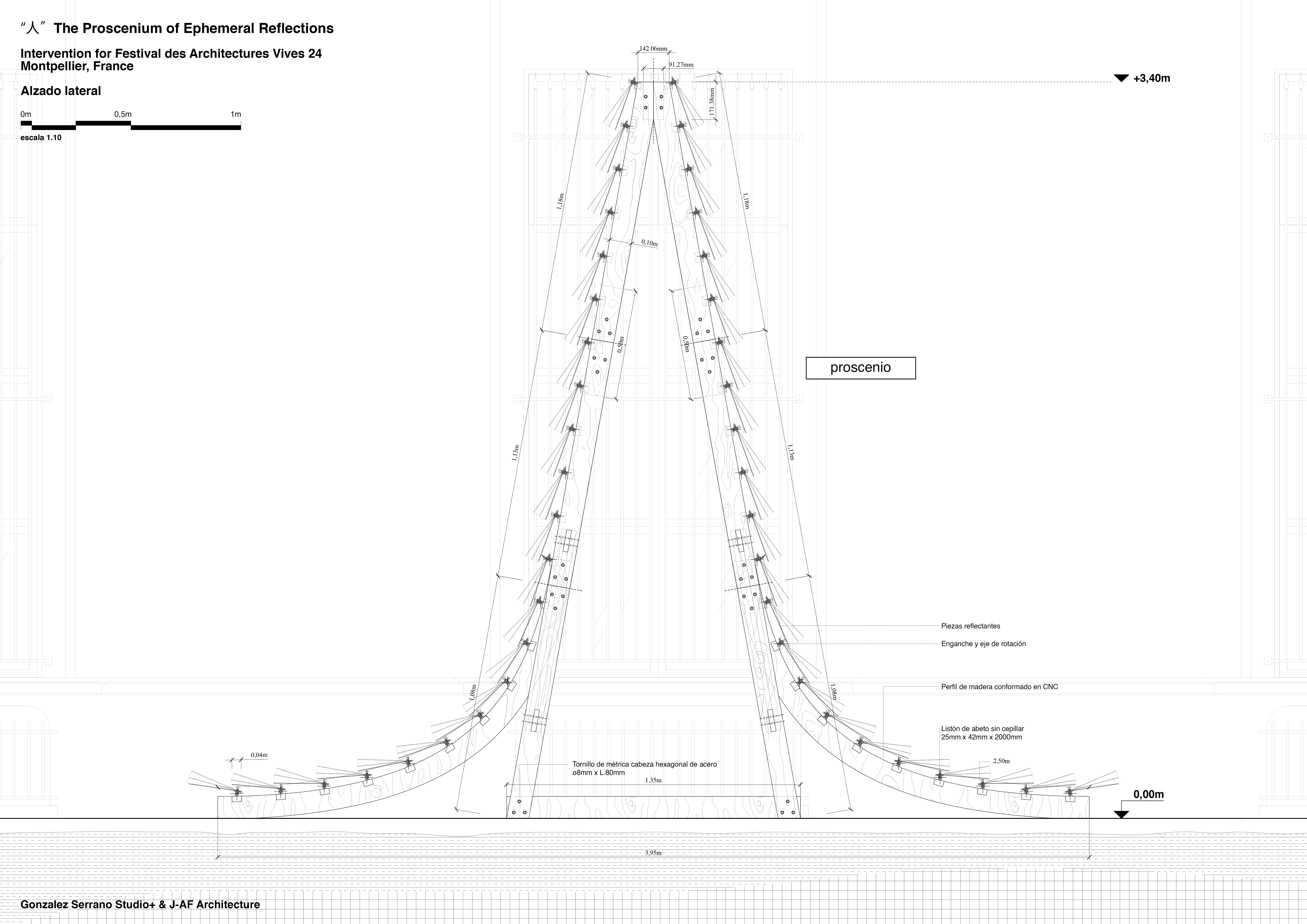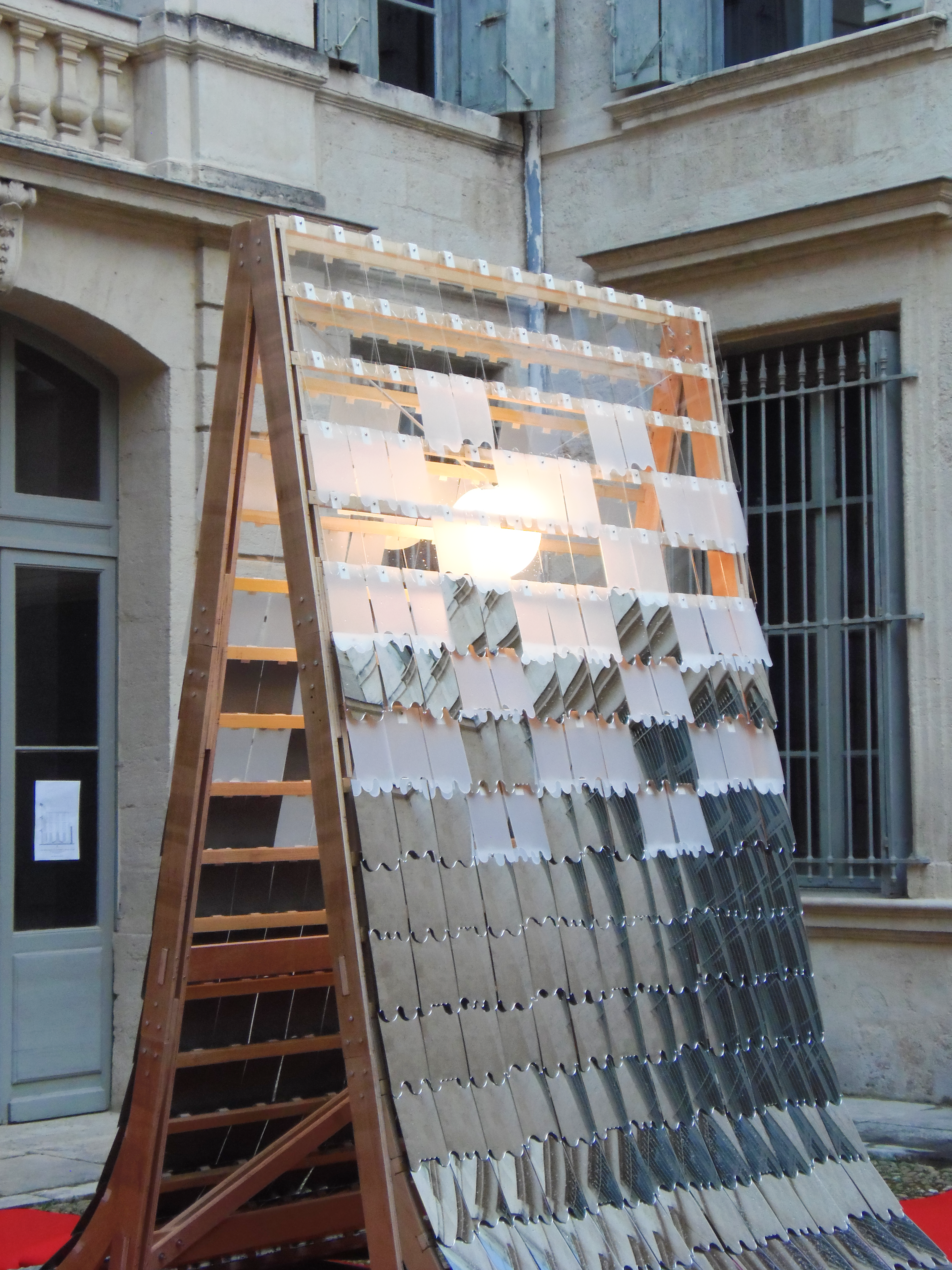 The kinetic facade was composed by 572 moving laser cutted acrylic pieces with a mirror finishing, these pieces were joined to the main eucalyptus cnc-shaped wood structure with the help of 572 3d printed pieces in recycle PLA that let the pieces to move freely under the efect of the wind.