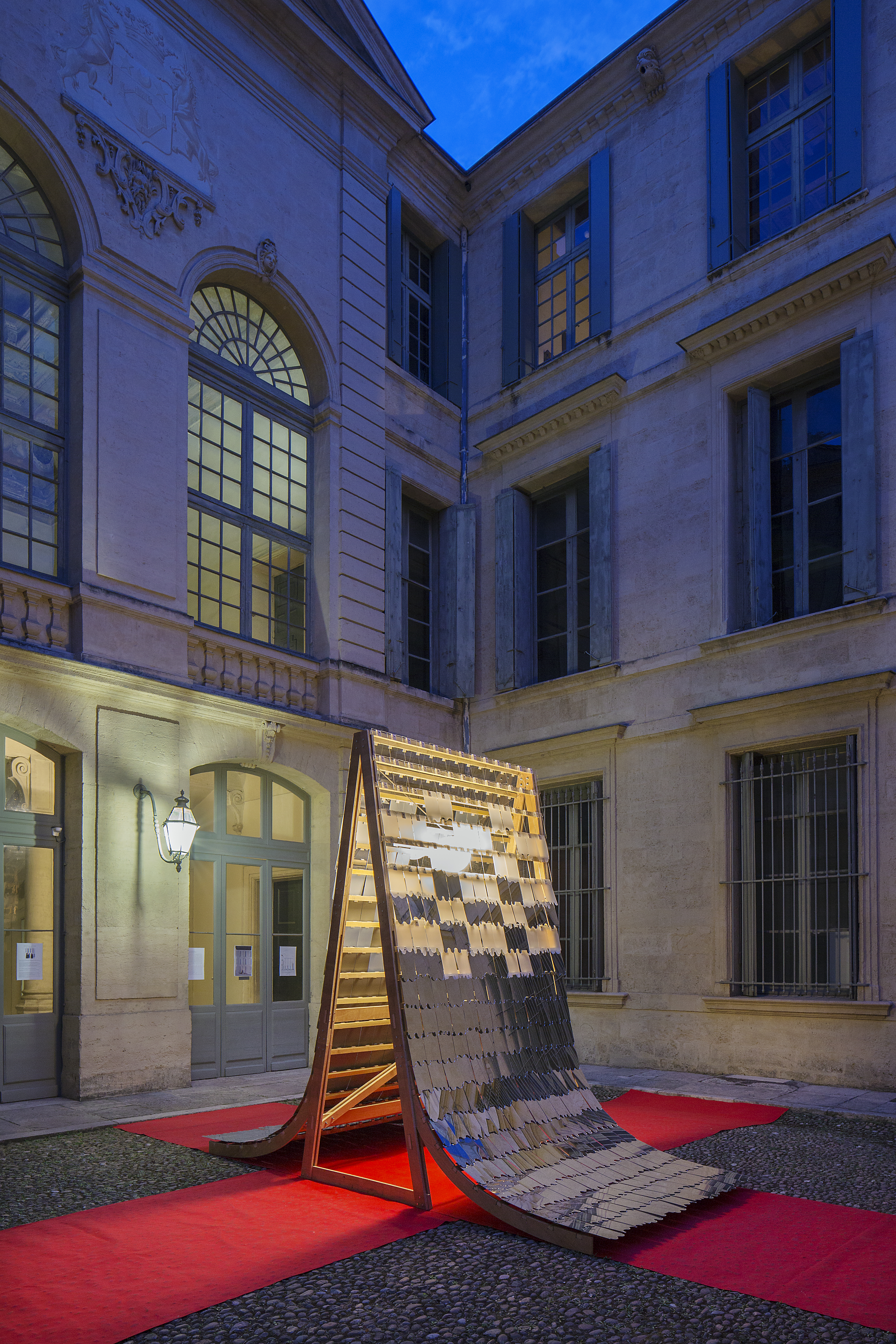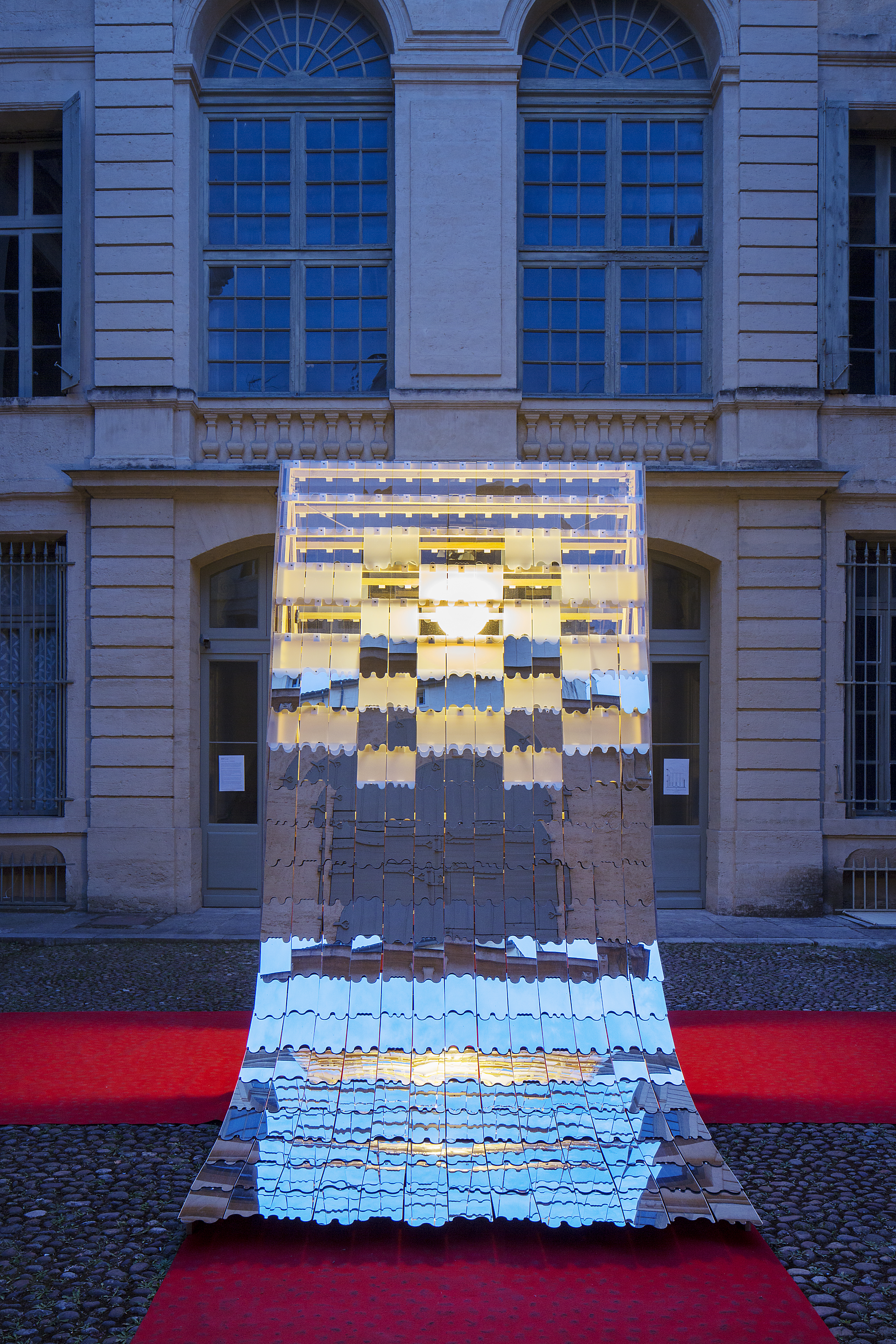 Scales appear that could belong to a living animal, with a set of moving patterns that can be understood as a symphony, a puzzle or a poem, light pieces that move with the wind, generating different visual effects in the object and in what is projected. Pieces that reflect the context, generating a background, highlighting the historical and blurring with the sky, generating a performative space through two opposing surfaces.