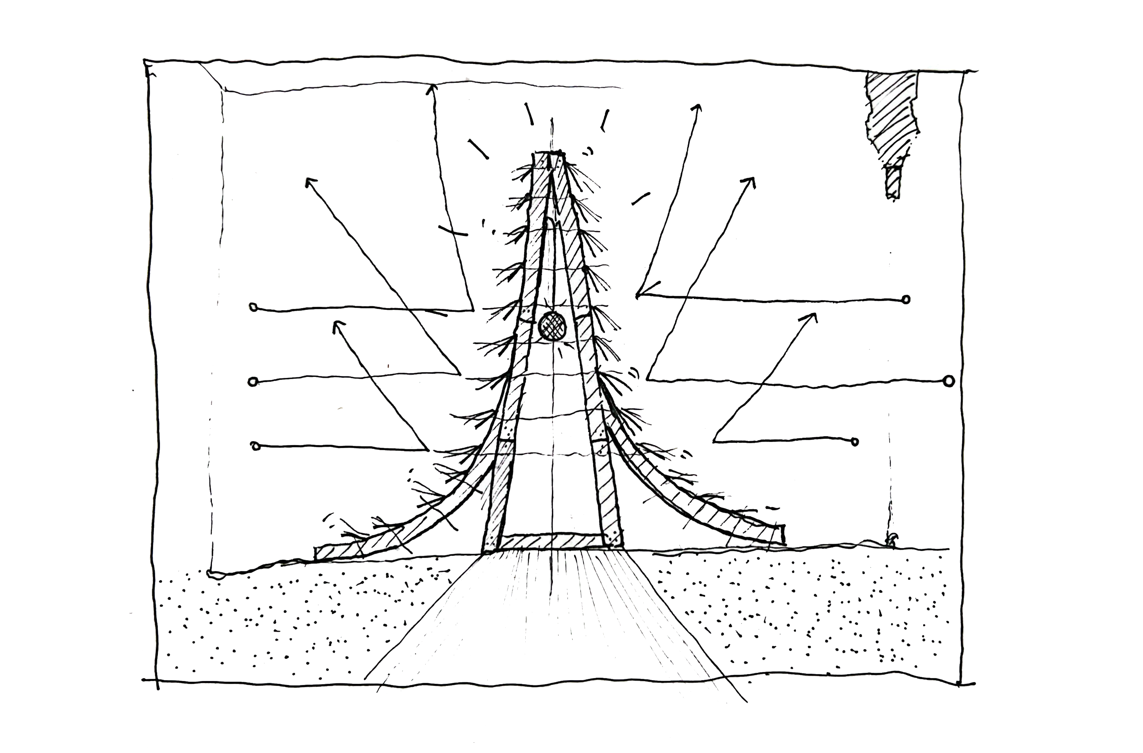 Two opposing surfaces formed, which evoke movement, the dissolution between what is built and what is not built, a contradiction between what is inside and what is outside, a diagrammatic reference to the person as the origin of movement and rhythm.