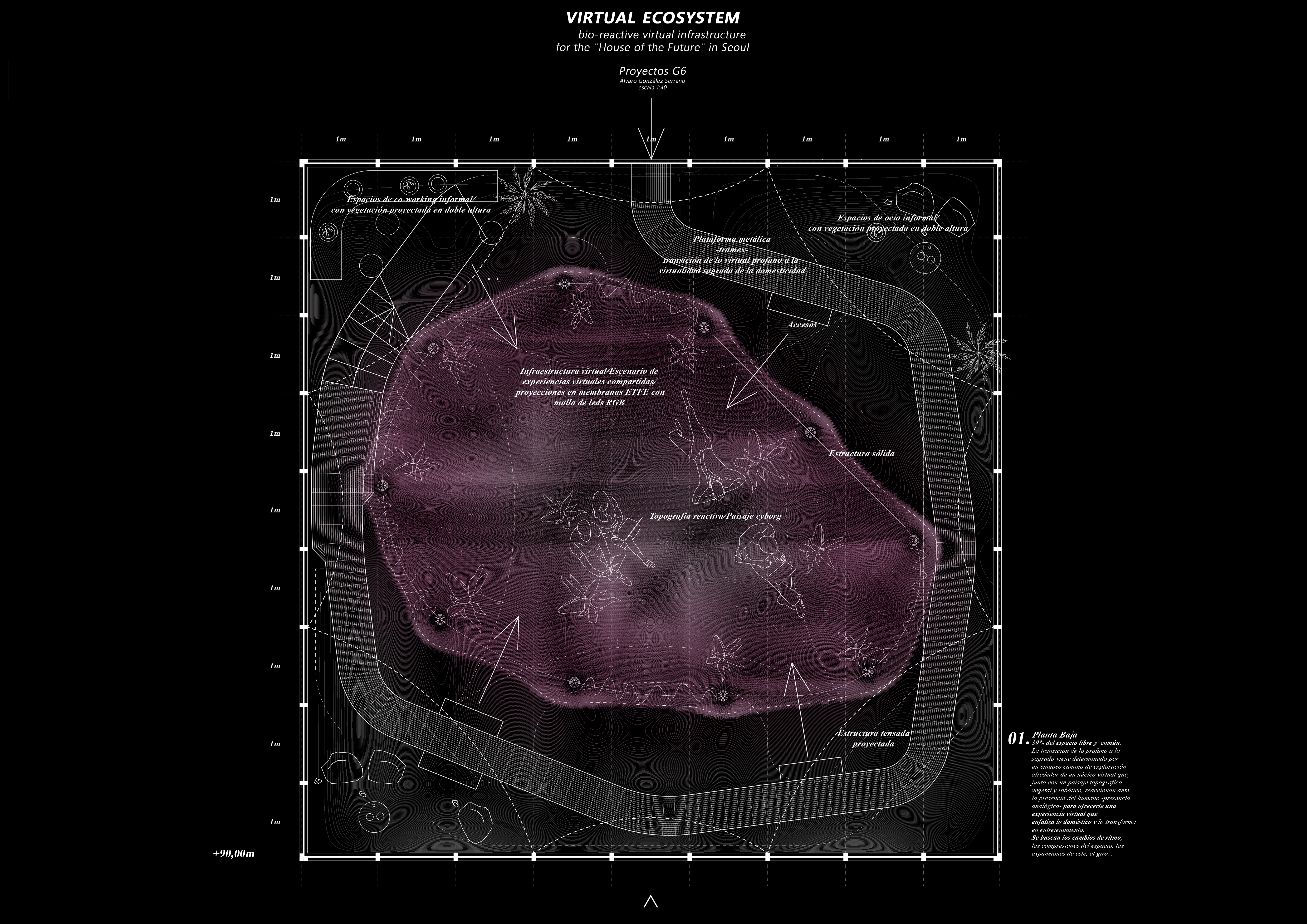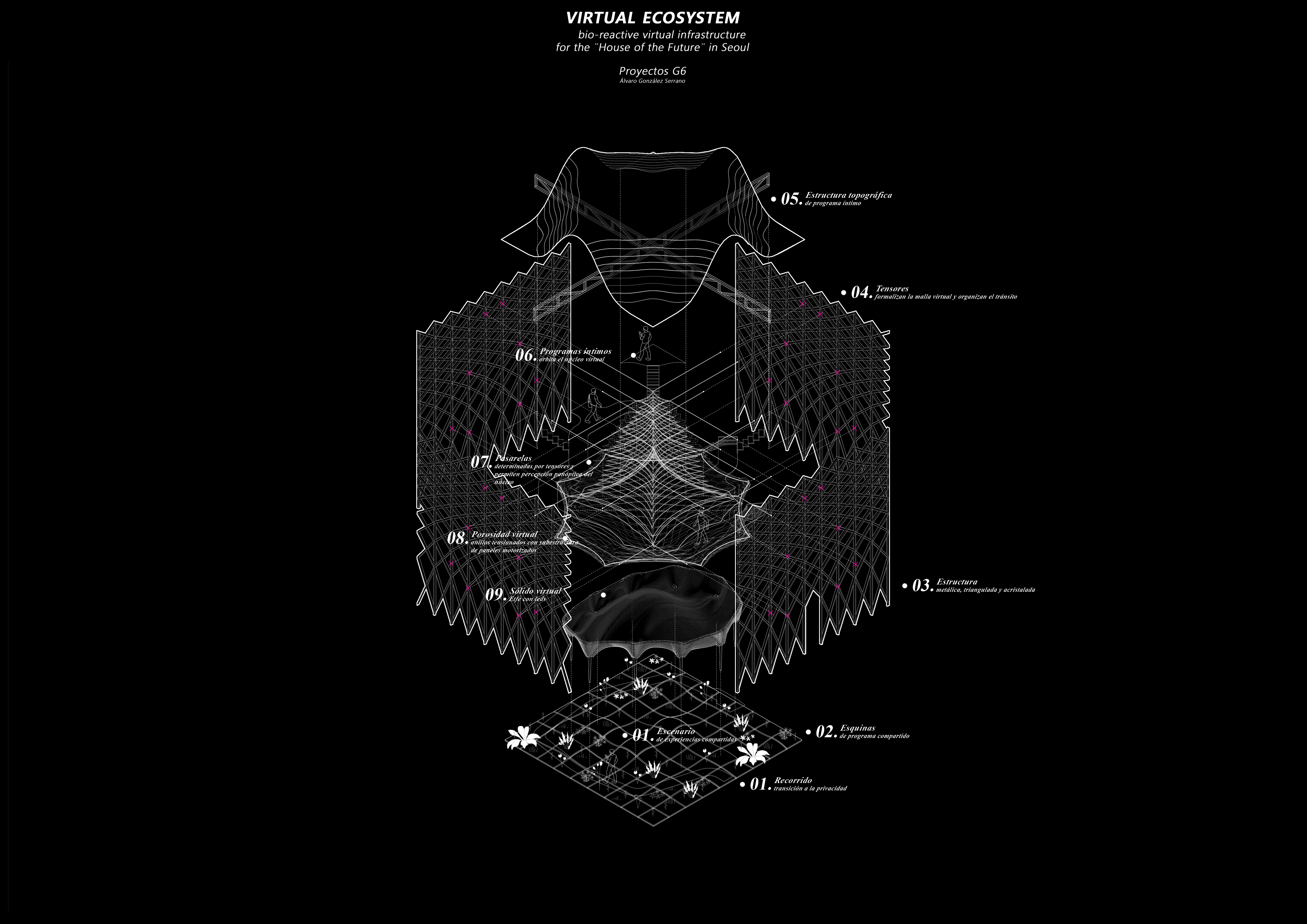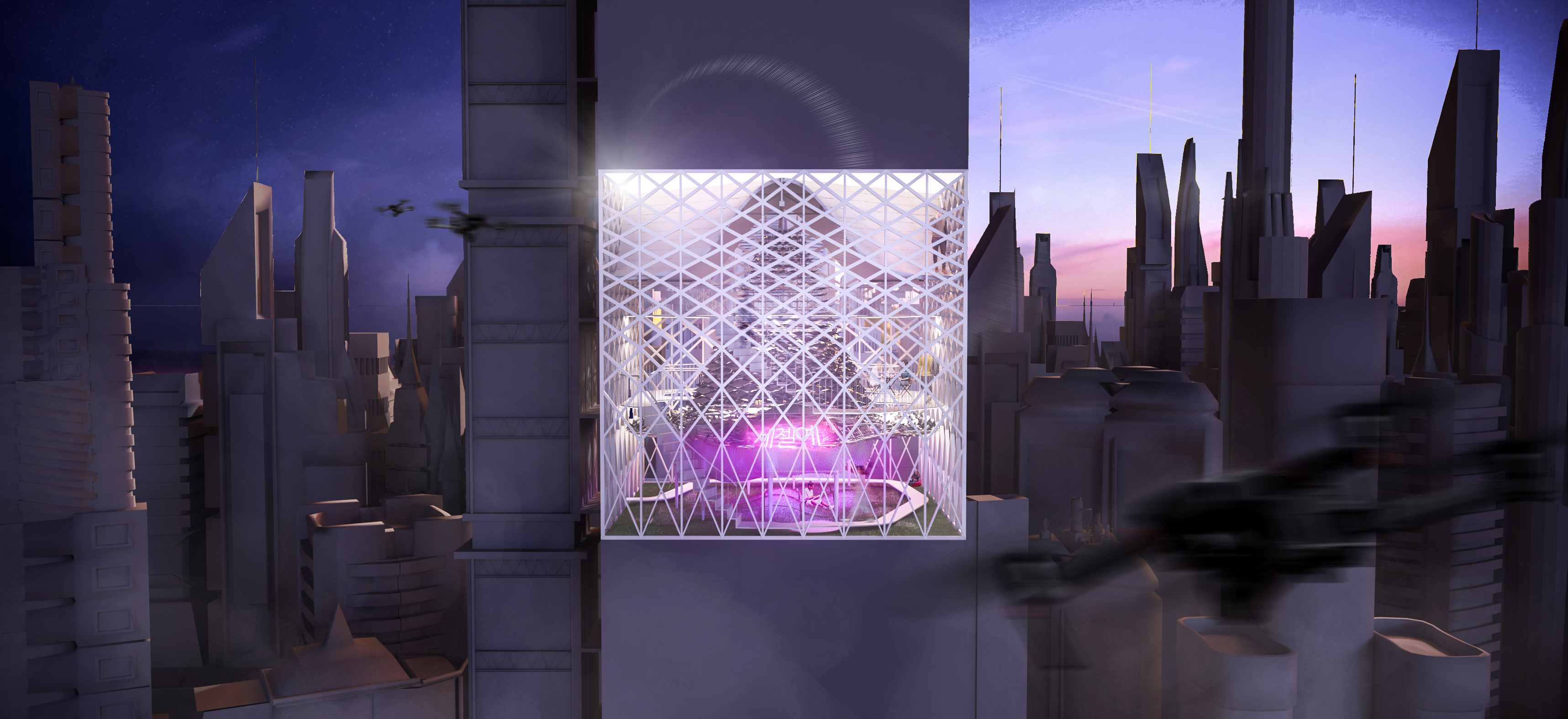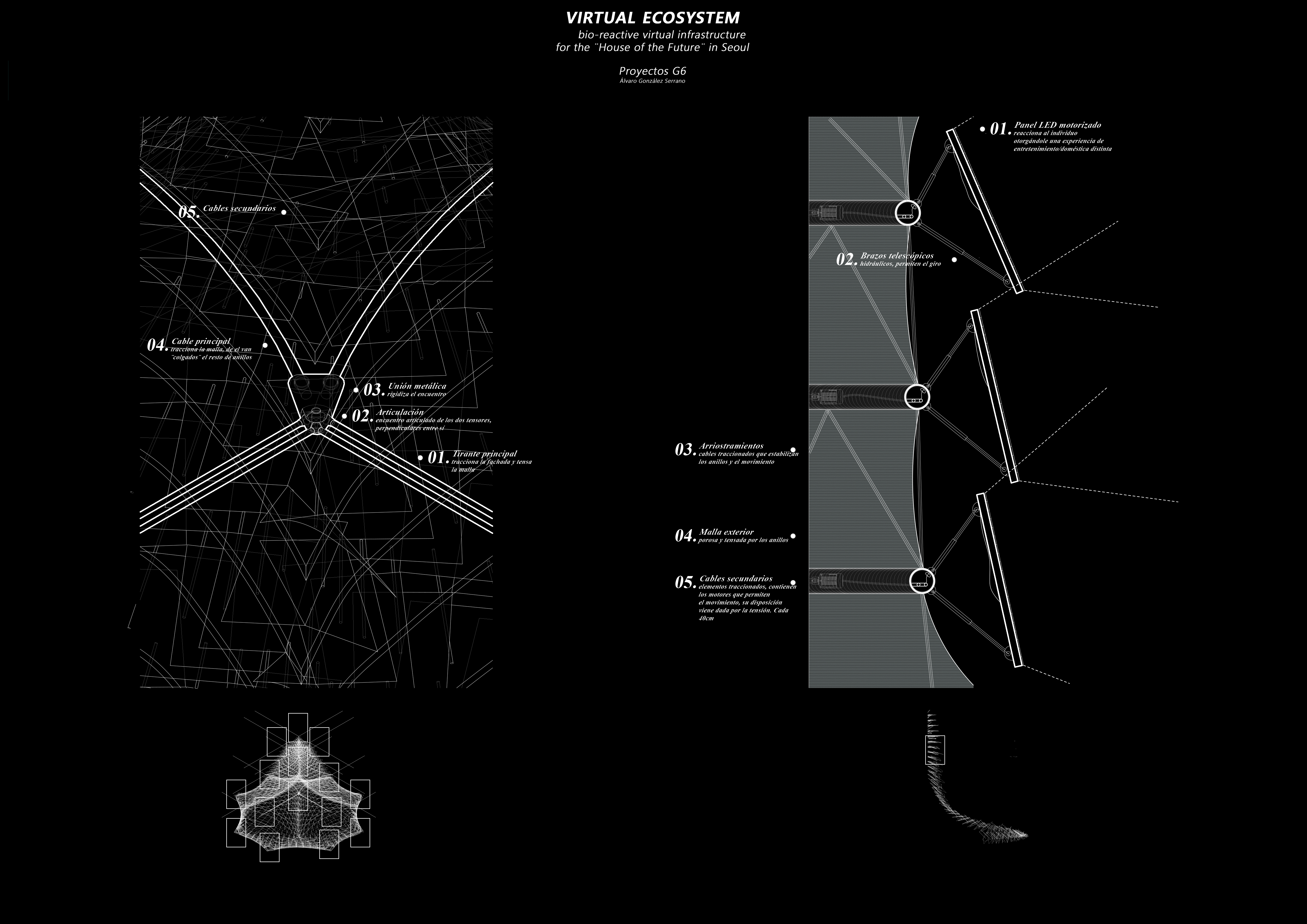 The project arises after an exercise in rethinking the domesticity of the future, from obsolete living machines to the effervescence of technology and shared experiences. The need to transform the static and opaque into the flexible and interconnected with the urban experience and its inhabitants is understood. A residential unit is projected, part of a skyscraper, in the city of Seoul, with dimensions of 9m x 9m x 9m. A virtual ecosystem where it is possible to explore and live on the border between the real and the virtual. This formal intersection will be a tensed, reactive and phenomenological structure with motorized led panels and multiple sensors around which we will orbit looking for the domestic spaces, as we go up, more private, with the ability to generate new types of experiences.