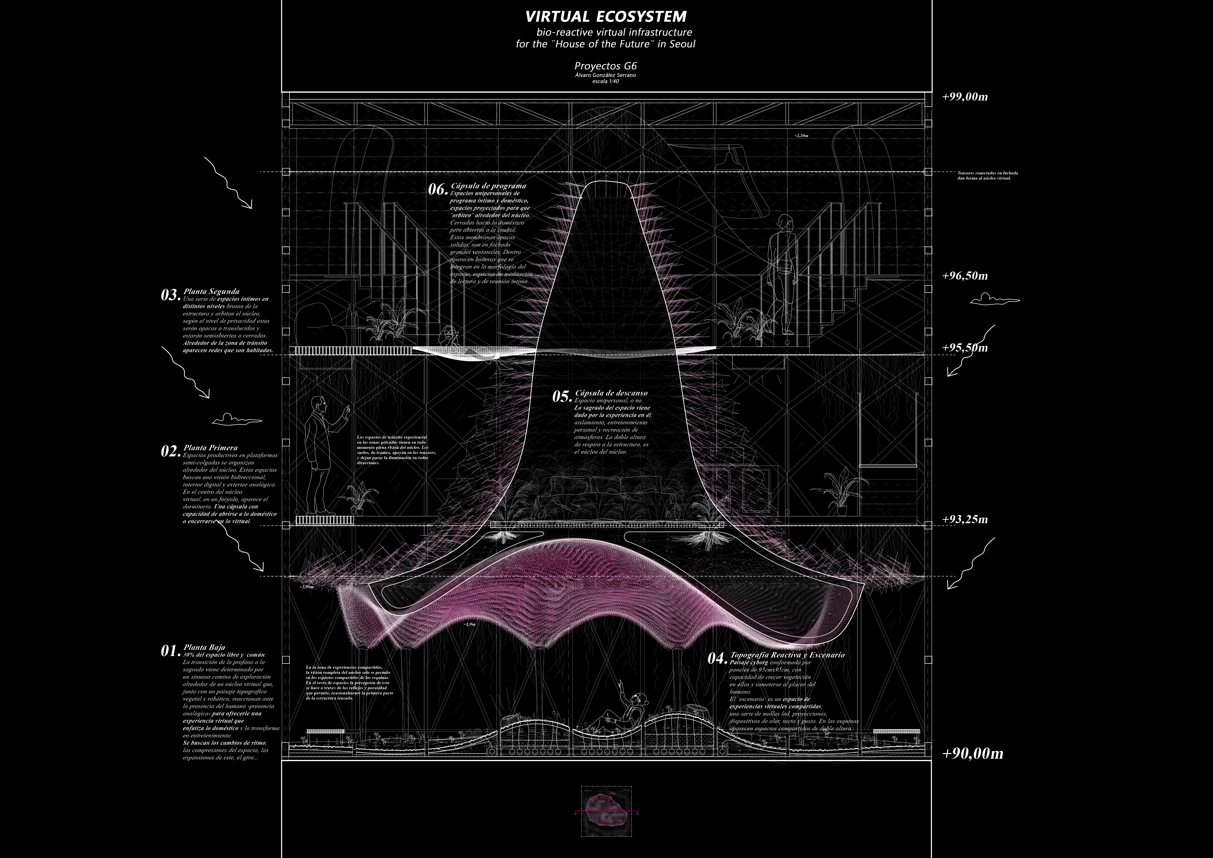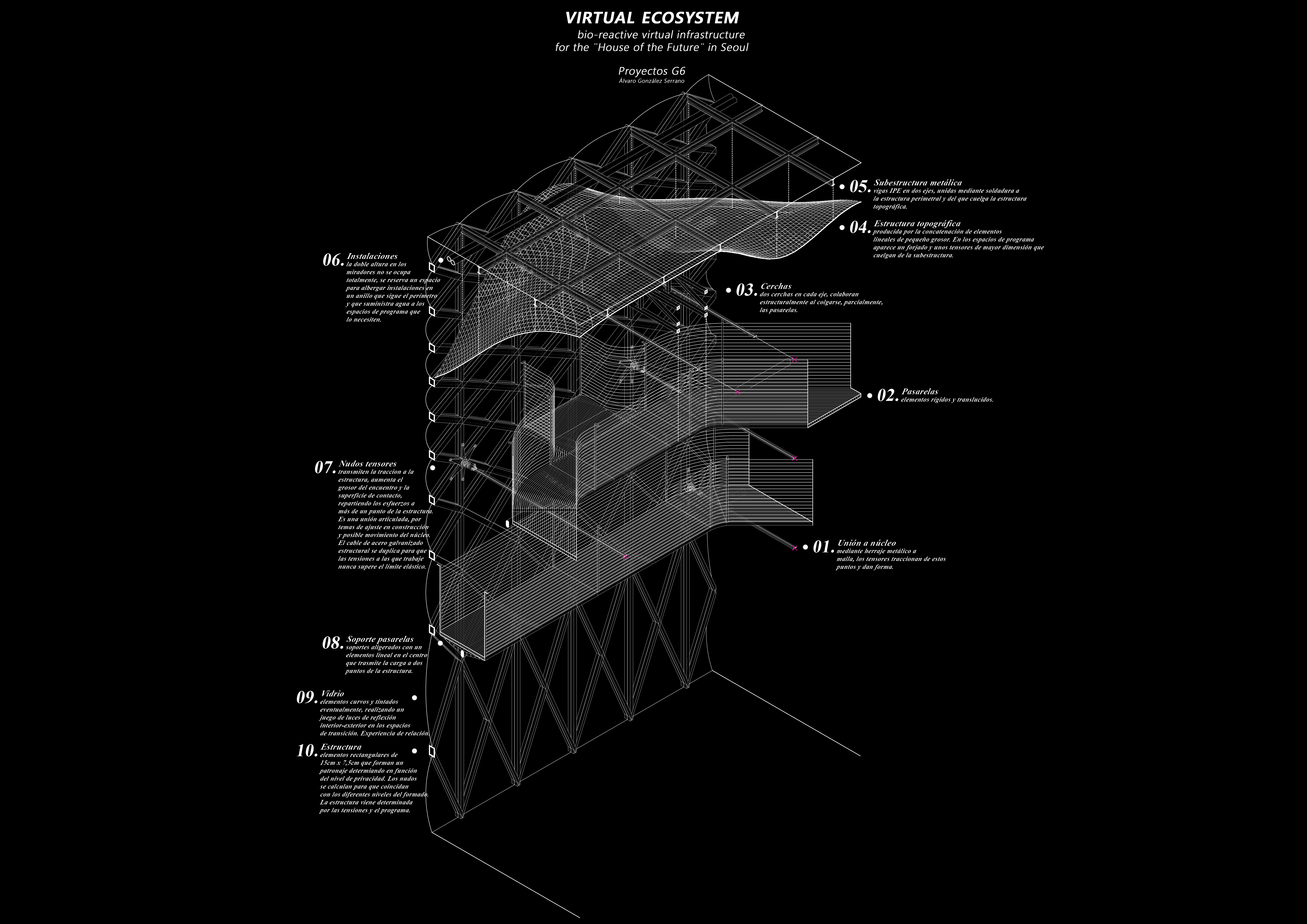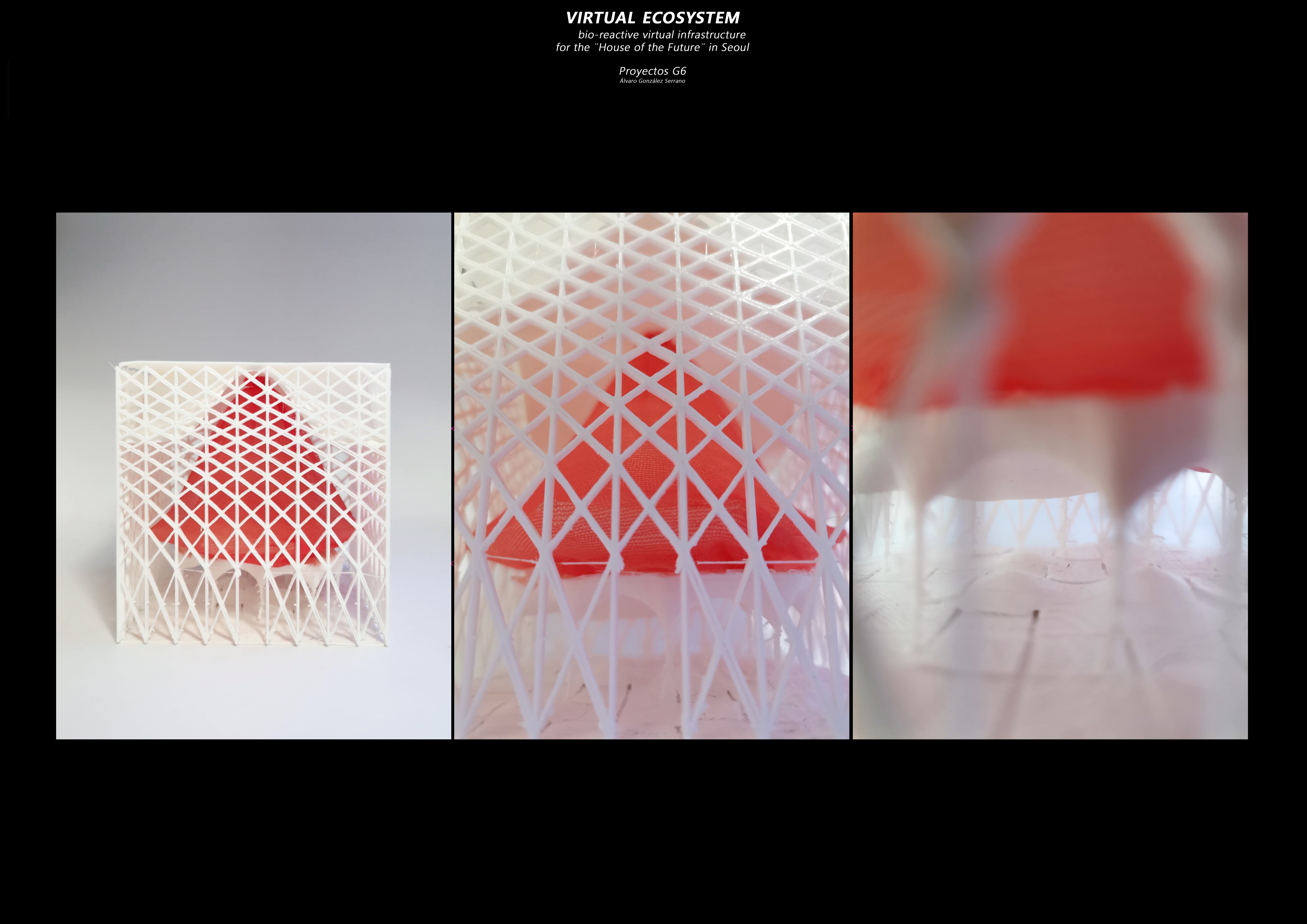 The project arises after an exercise in rethinking the domesticity of the future, from obsolete living machines to the effervescence of technology and shared experiences. The need to transform the static and opaque into the flexible and interconnected with the urban experience and its inhabitants is understood. A residential unit is projected, part of a skyscraper, in the city of Seoul, with dimensions of 9m x 9m x 9m. A virtual ecosystem where it is possible to explore and live on the border between the real and the virtual. This formal intersection will be a tensed, reactive and phenomenological structure with motorized led panels and multiple sensors around which we will orbit looking for the domestic spaces, as we go up, more private, with the ability to generate new types of experiences.