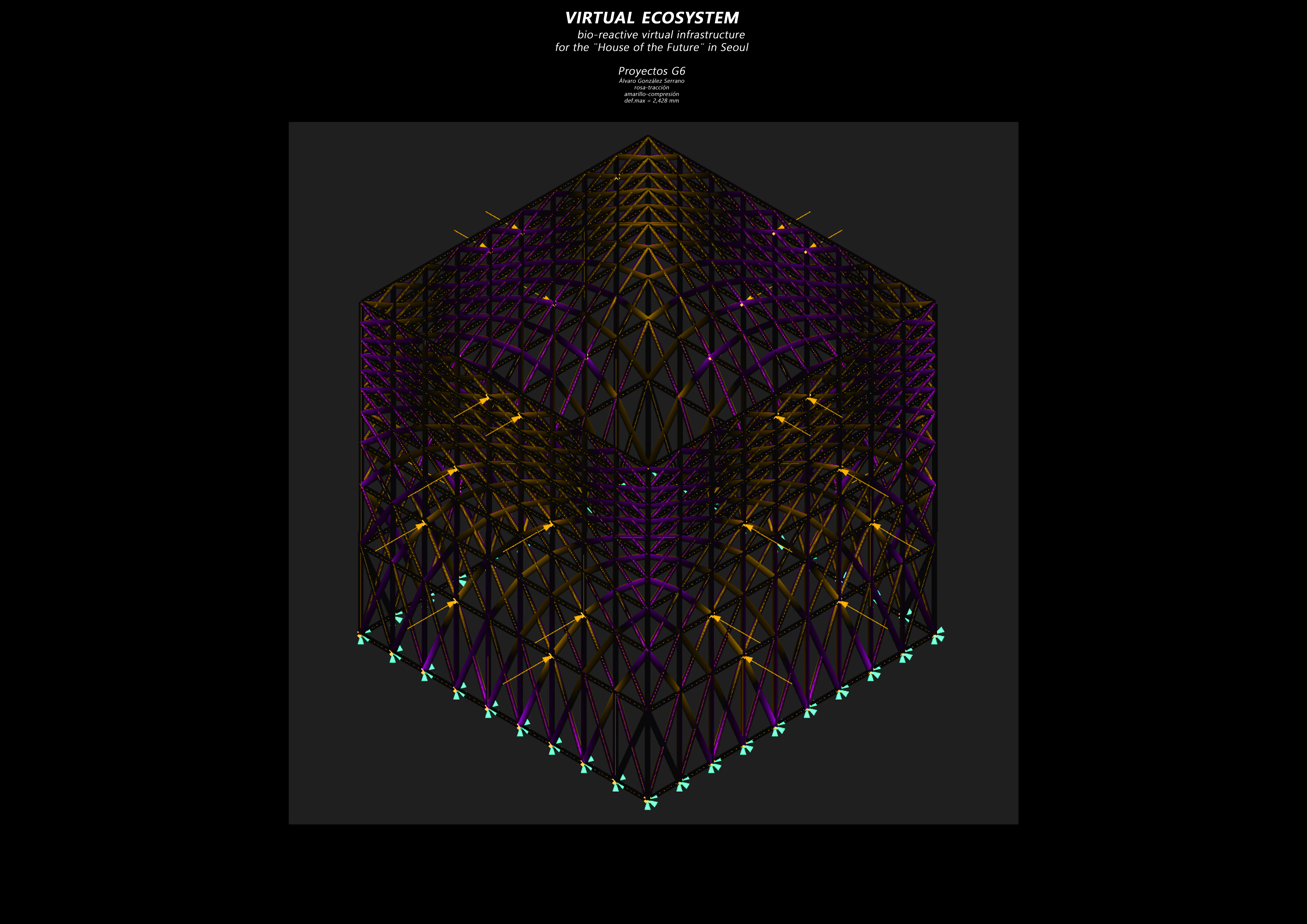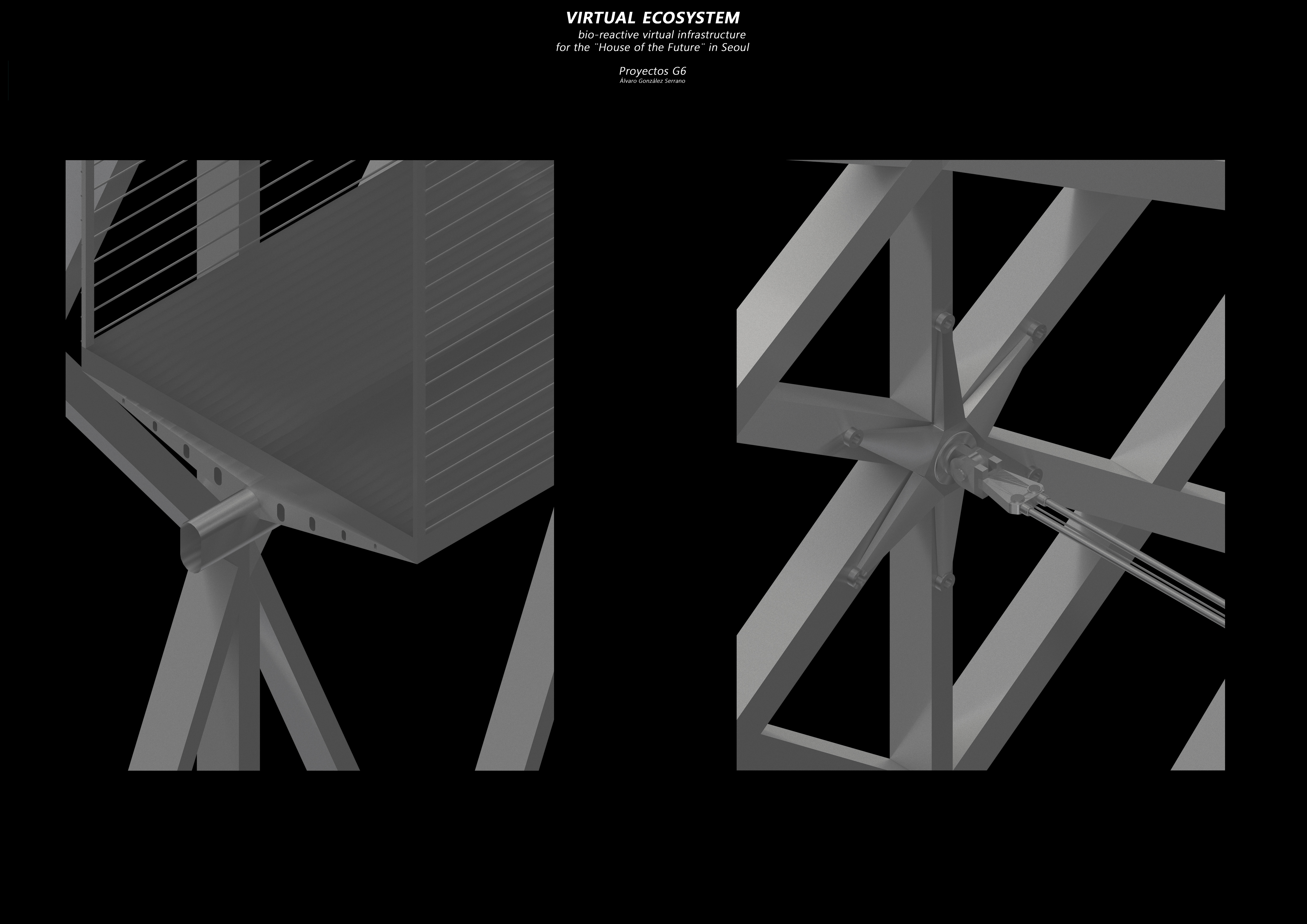 The virtual structure is a inhabitated matrix of independent and motorized led panels that respond to the frequencies produced by humans and non-humans rotating towards the viewer to generate virtual analog and virtual digital experiences. Inside it has a bearing substructure in rings to which the panels are connected. It is a prototype for the Future House in Seoul.