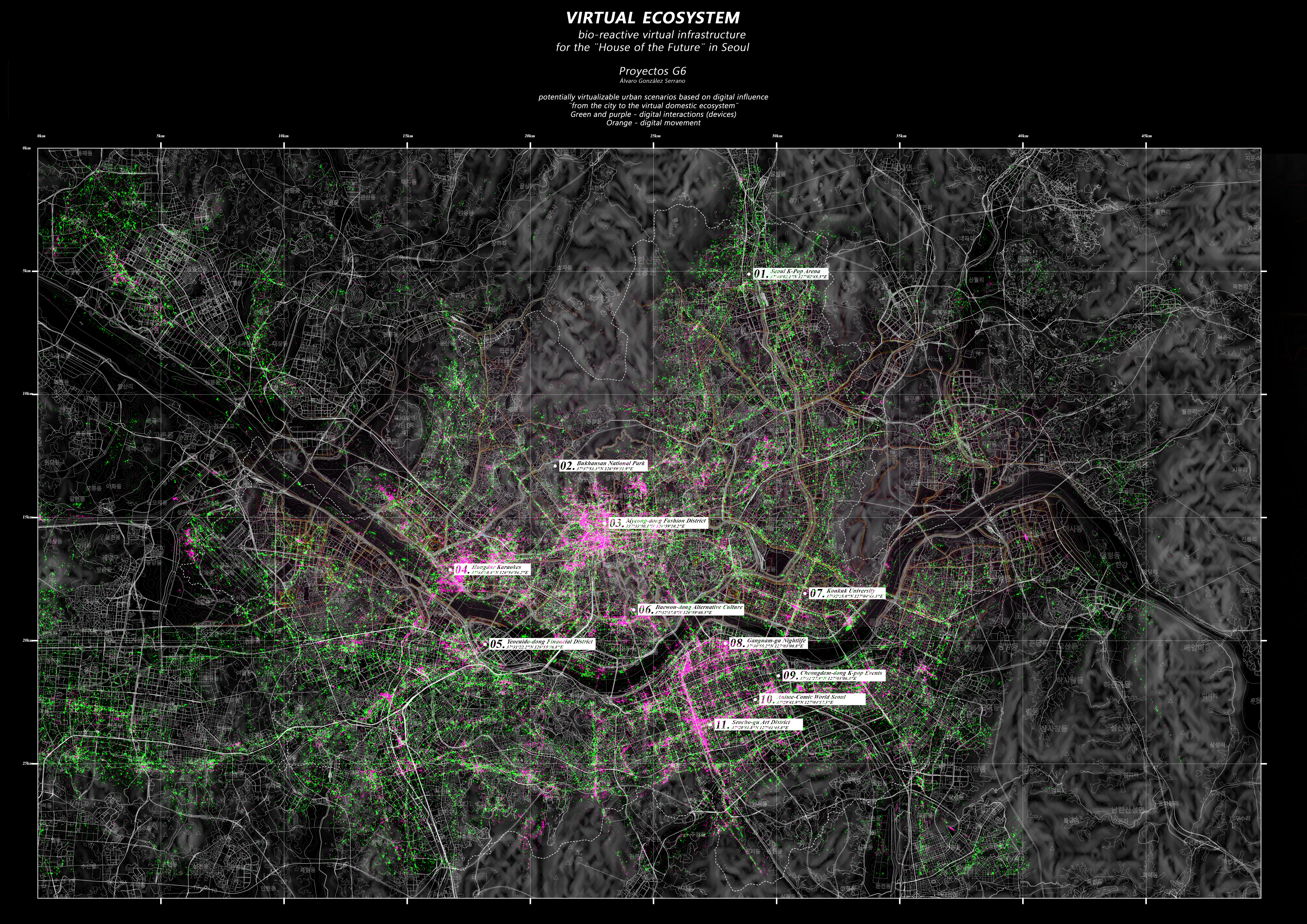 Considering our module as the ¨germ¨ that inhabits the intersection, it is given identity after having mapped the virtual city that is generated by observing digital interactions in the urban physical space, this analysis lets us know which are those spaces with the most reactions, the most popular and the most interesting. These spaces will be potentially virtualizable scenarios, which will be recreated in the home, using projections, sensors, scent dispensing devices, specific textures and a reactive topography.